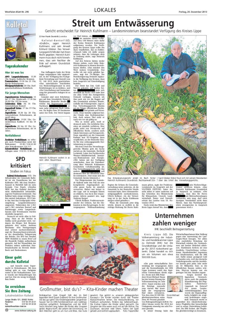 Der Fall Kuhlmann erregt Aufmerksamkeit. Am 20. Dezember 2013 berichtet das Westfalen-Blatt. Heinrich Kuhlmann konnte in dem Jahr mit seinem Rechtsanwalt Eckhard Gläsker einen beachtlichen Erfolg erringen. Das Verwaltungsgericht Minden gab den beiden Recht und wies zuvor verordnete Zwangsmaßnahmen zurück.