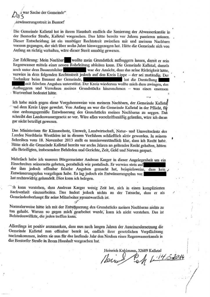 Der Prozess beim Verwaltungsgericht Minden war 2013 gewonnen. Heinrich Kuhlmanns Nachbar weigerte sich jedoch, dieses Urteil anzunehmen. Der Nachbar pochte auf sein positives Urteil von einem Zivilprozess am Amtsgericht Detmold. Heinrich Kuhlmann hatte sein Urteil vom Verwaltungsgericht Minden in der Hand. Der Streit ging weiter, obwohl die Verantwortung für das Niederschlagswasser des Nachbarn von Anfang an bei öffentlichen Trägern lag. Das stellte Heinrich Kuhlmann in einem Schreiben vom 14. Mai 2014 heraus.